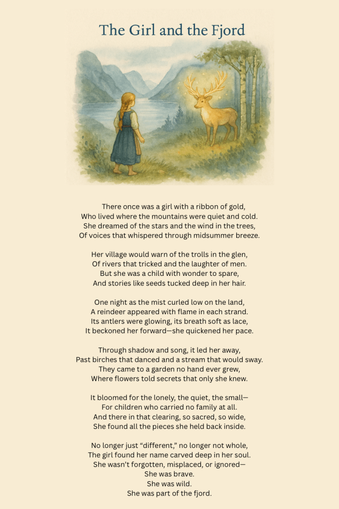 She told me about a girl with hair like sunlight, who lived in a village where fjords met the clouds. A brave girl who followed a glowing reindeer into the forest and found a hidden garden that only appeared to the pure-hearted. There were trolls who guarded bridges, and whispers in the wind that spoke in riddles. It was all make-believe. But to me, it felt like scripture.